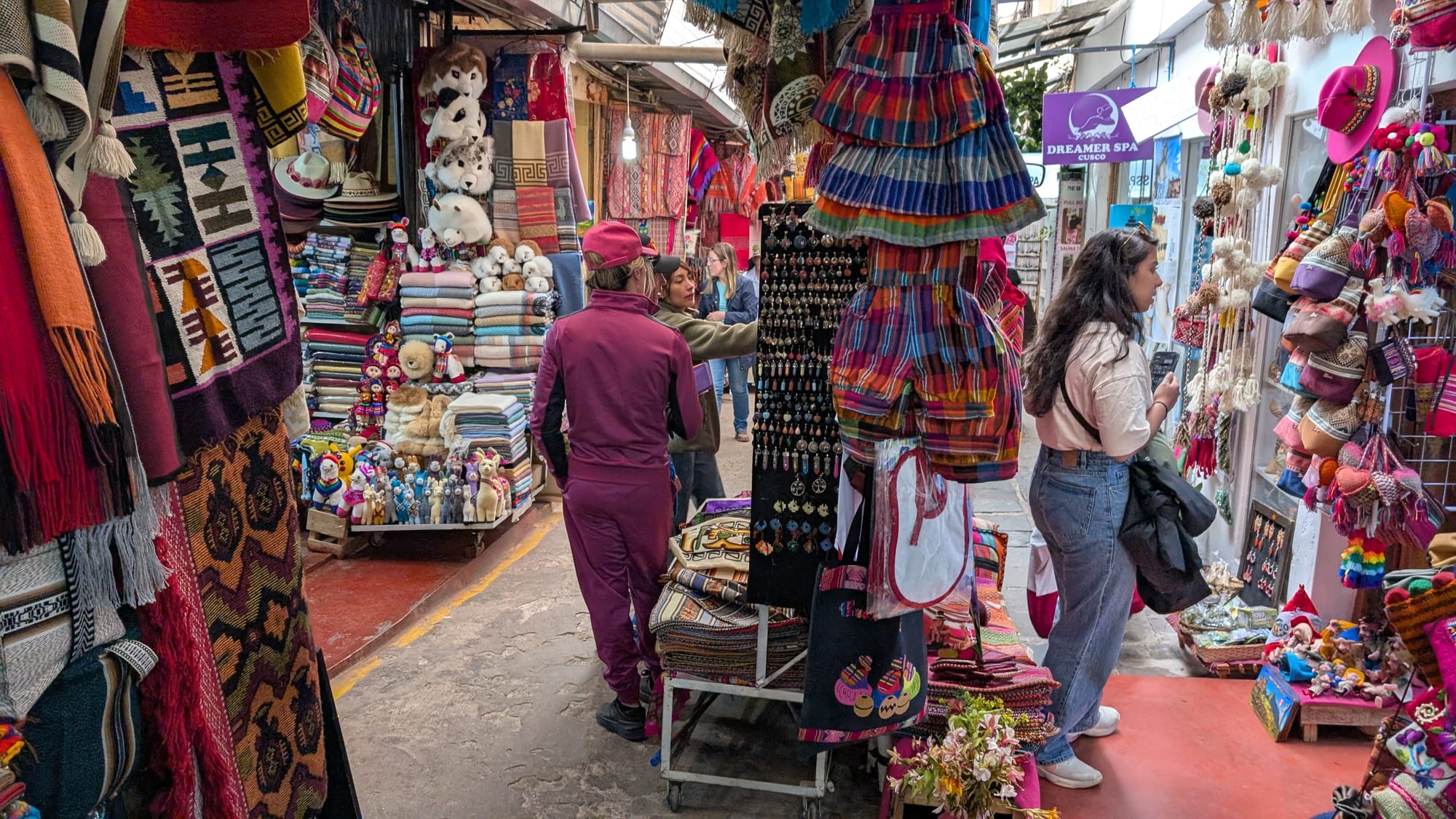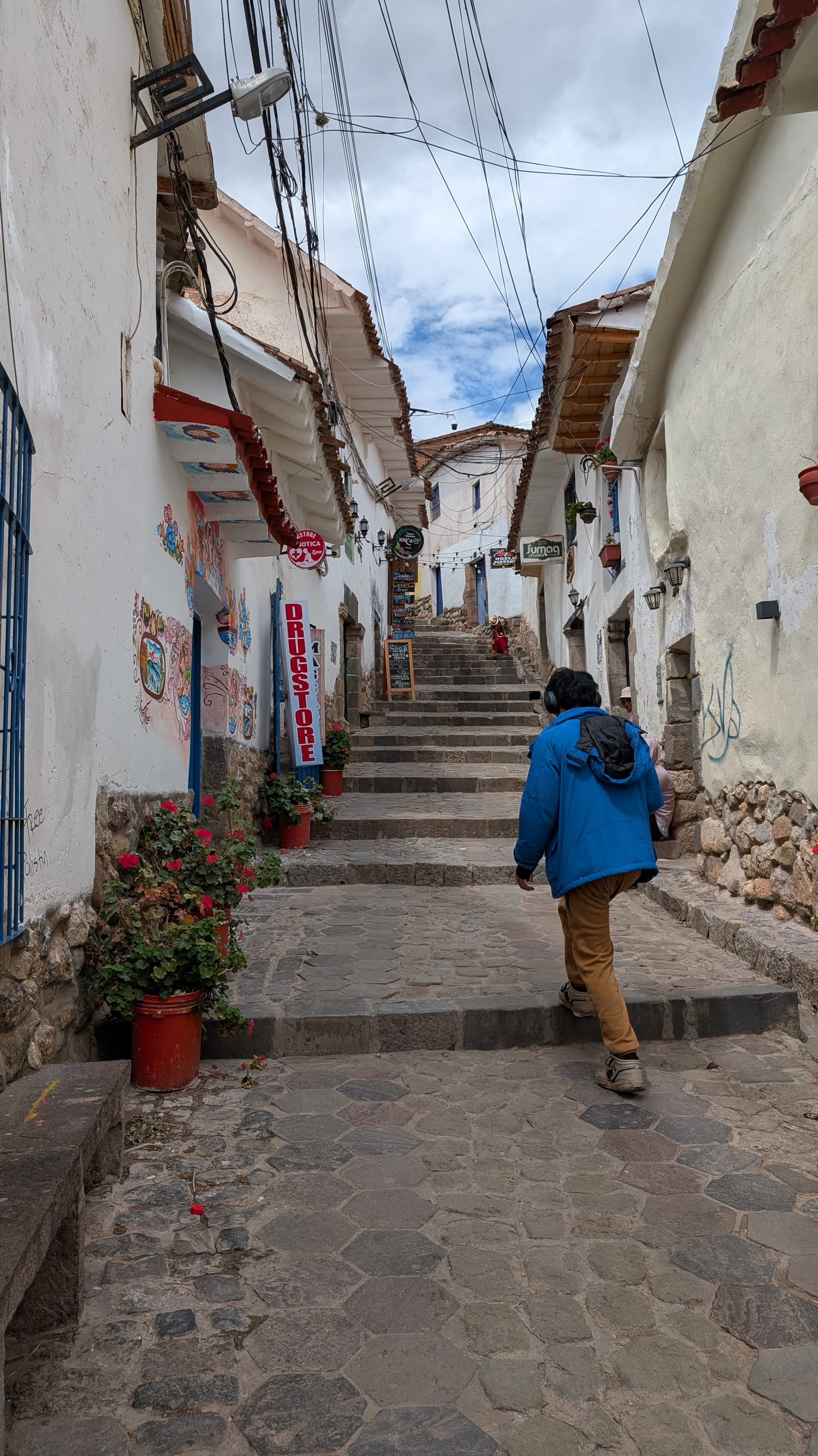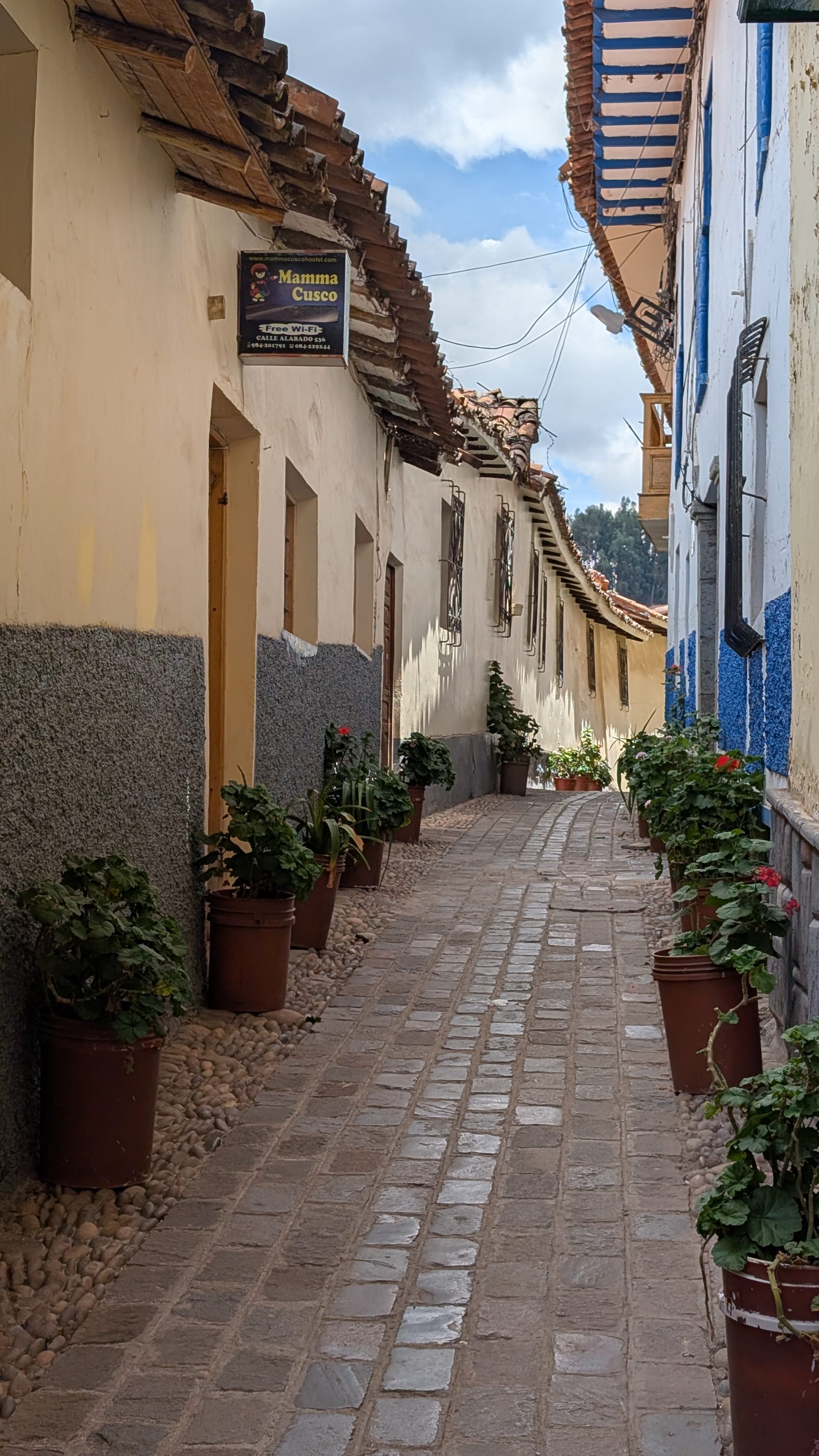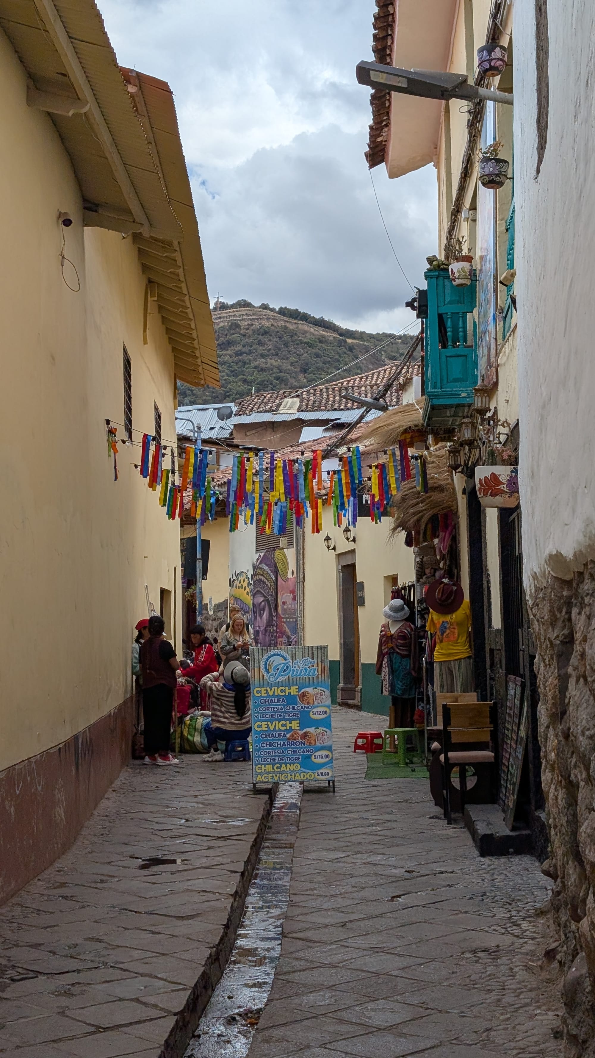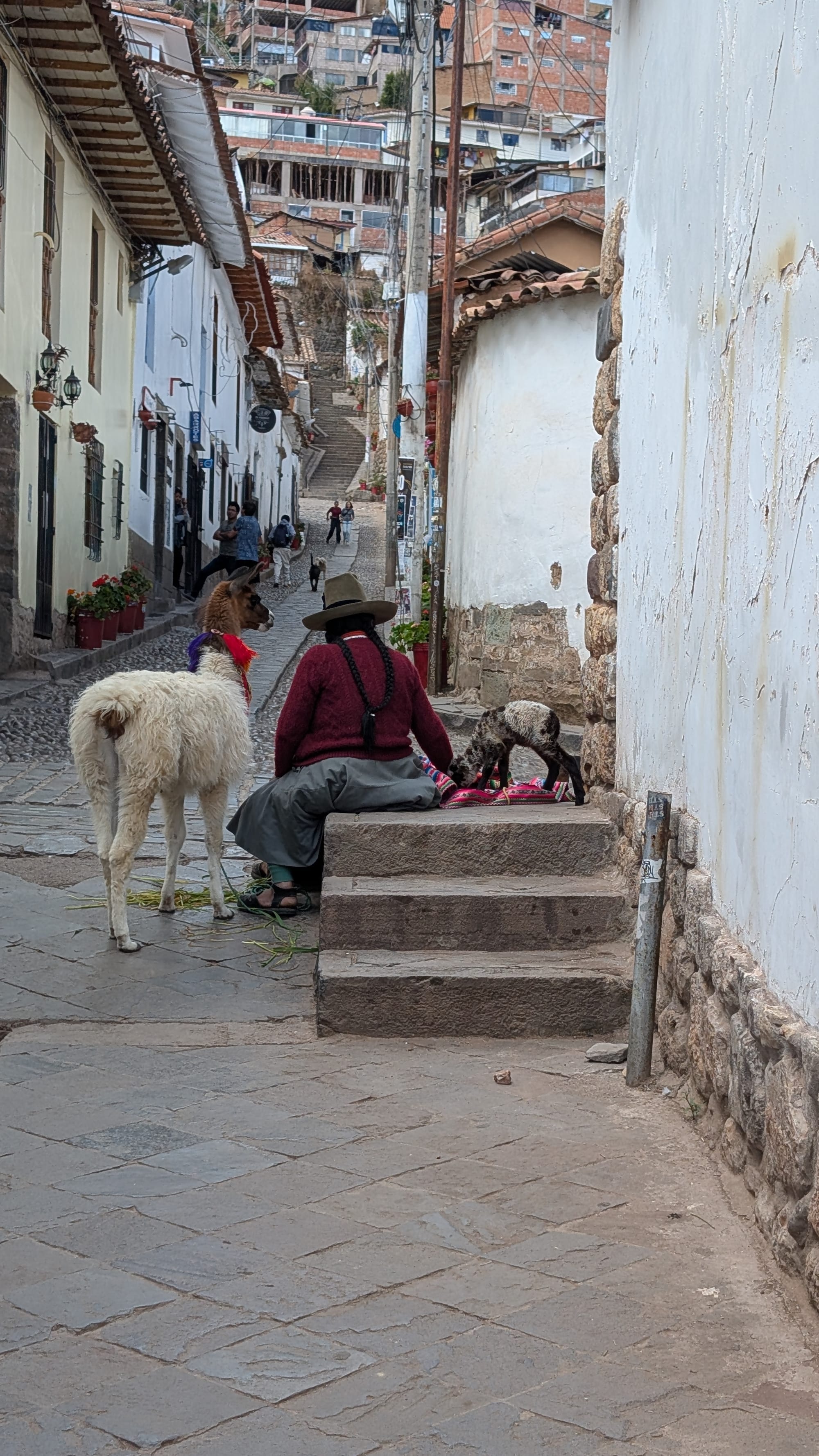 Lähdin käymään kaupungilla katsomassa jos löytäisin jotain mukaan. Cuscon keskusta on aika turvallisen oloinen. Tosin kaikki reissut on lähtenyt aika aikaisin aamulla ja kun kävelee viiden aikaan keskustorin läpi se on täynnä juopineita teinejä. Mutta päivisin tämä on idyllinen. Katujen varressa on mummoja ja alpakoita myymässä matkamuistoja ja yhteiskuvia.